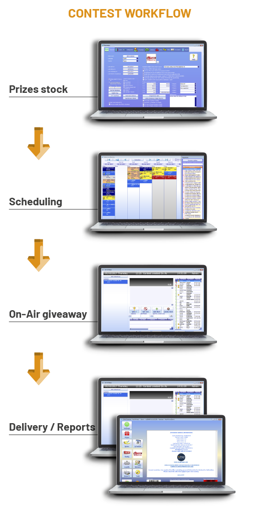 - Schedule card including : contest time, contest title, presenter, prize, contest instructions, comments, number of calls for this contest, contest barcode, contest status, winner(s) delivery date, shipment cost